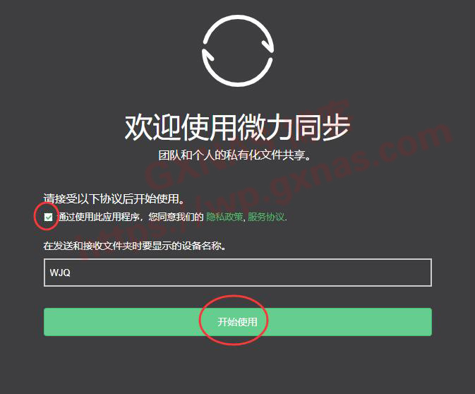 6、首次使用,需要同意官方的“隐私政策”和“服务协议”,所以先打勾,再点“开始使用”;