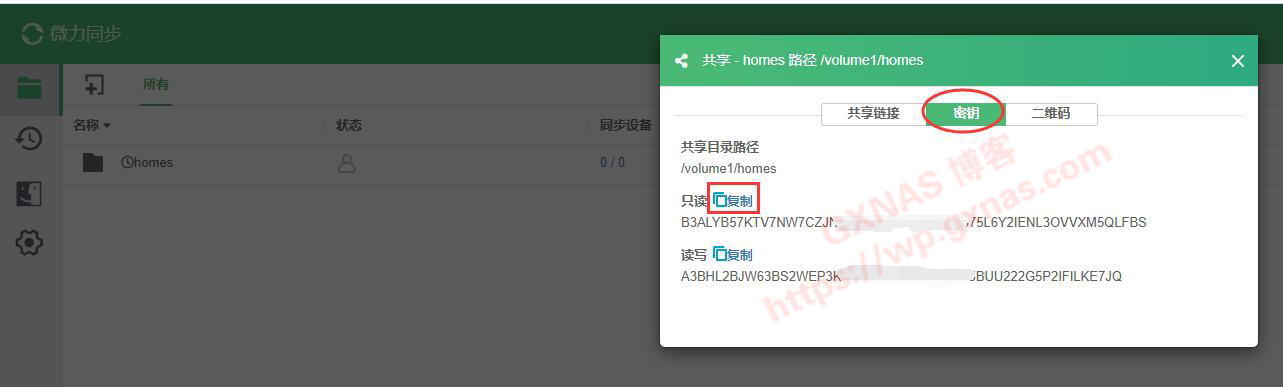 本教程用的是只读的密钥,群晖的文件夹只下载不上传。