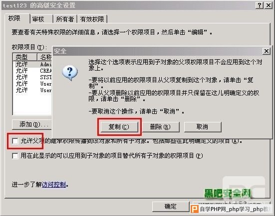 取消允许父项的继承权… 前面的勾,然后点击复制,选中权限项目里的都删除,只剩下administrators 和system 然后再点击添加.