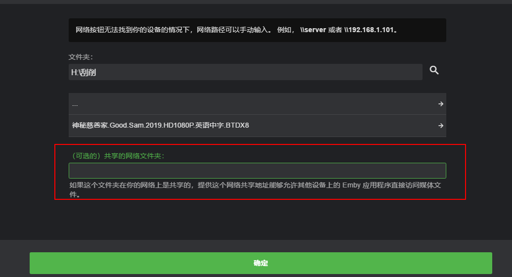 可选的 共享的网络文件夹,这个其实就是个绝对路径地址,适用于外部软件的连接,作为直通播放,比如你在外网使用其他的设备连接你的EMBY服务器,例如使用KODI的EMBY插件,然后KODI就可以在外网直接观看你的EMBY服务器,而无需转码,如果不在外网观看,本地局域网的情况下,这个可以不选,后期讲KODI与EMBY互连的时候说,然后点击确定后,退出来,到下一步。