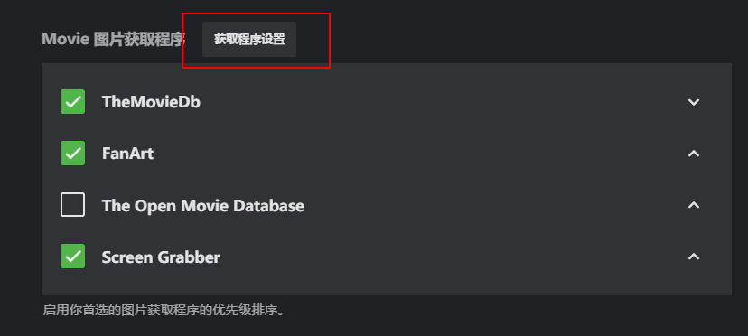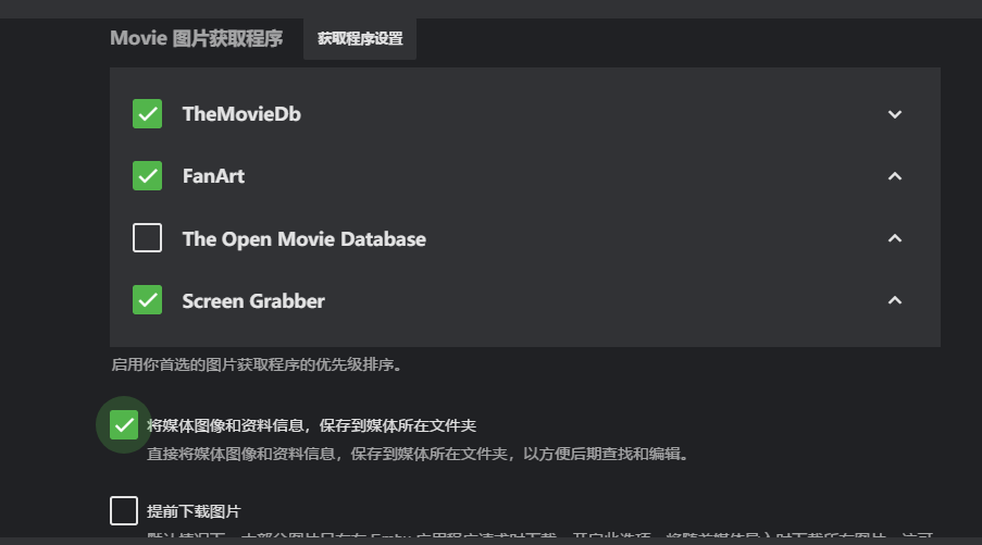 然后设置默认刮削数据库的顺序,第一个为TheMovieDb,也就是我们的主刮削对象的数据库,FanArt这个也是全球最大的影片海报与同人画,背景图的数据库,主要就是电影的图片,Screen Grabber这个是EMBY自带的截图,当以上两个数据库网站都没有图片的话,EMBY会默认给你截图显示,不会给你留个空白的媒体库页面。