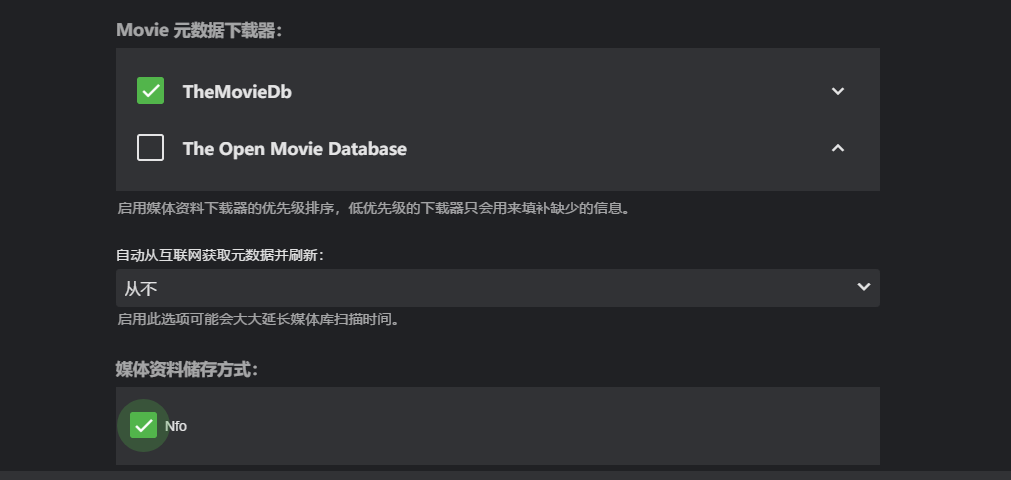 这里的元数据下载,我们就选择TheMovieDb即可,另外的The Open Movie Database数据库是无中文信息的,所以我们不需要开启,媒体资料存储方式,选择NFO。