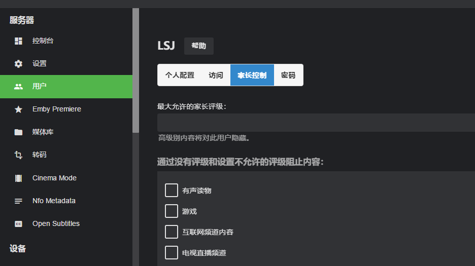 用户这里,可以添加其他的来宾用户,类似于Windows的来宾用户,可以设置很多的权限,比如不让下载,不让转码,设置密码访问,家长控制,不让小孩子看大人看的东西等等,这里就不讲了,具体参数都写的很明确,自己设置。