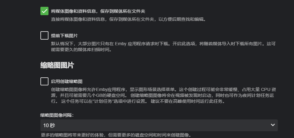 提前下载图片,这个也就是当你有新的电影添加进去的时候,默认会全部下载信息,这种适用于首次使用EMBY的用户,后期是不需要的,会增加服务器扫描的时间,比如你全部扫描完成后,把这个提前下载图片关闭,后期在单独添加影片的时候,你不去点击这个影片,就不会刮削,点击之后,才会单独刮削这部影片,而不是整个EMBY扫描全部的媒体库,这样节省很多时间,与减少EMBY的运行负载。