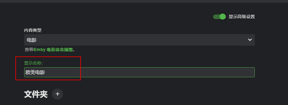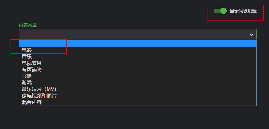 记得开启显示高级设置,然后选择你想要添加的媒体库类型,本篇以电影为例。