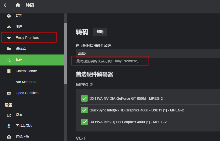 转码,由于EMBY从3.5.3版本之后,就开始闭源,而且很多以前的功能,变为付费功能,比如转码,下载,同步等等,这里你设置不设置,默认都是软解,除非是付费用户才可以开硬件解码,比如用GPU转码,免费的版本都是CPU转码,这个没办法解决,除非花钱,或者是使用更低的版本,比如3.5.3或者是之前的版本,软件默认除了H.264编码的视频外,和音频编码为ACC的,其余的编码格式都是要转码才可以播放,不想转码播放,只能用其他的软件加以辅助,比如KODI,或者是官方出的本地客户端等,但是官方出的客户端,也是要花钱的,所以还是使用KODI的EMBY插件做到免费,而且直通播放,这样就不需要转码播放了,后期我会讲KODI和EMBY互连的内容。