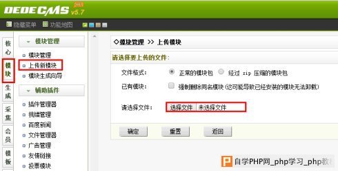 3、到dedecms的后台-模块-上传新模块,选择和自己dede网站编码对应的版本。