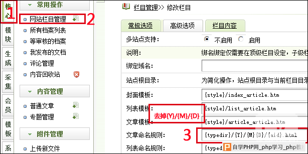 进入DEDECMS后台 → 核心 → 网站栏目管理 → 选择网站栏目上的更改 → 找到文章命名规则选项( {typedir}/{Y}/{M}{D}/{aid}.html ) → 去掉{Y}/{M}{D} → {typedir}/{aid}.html