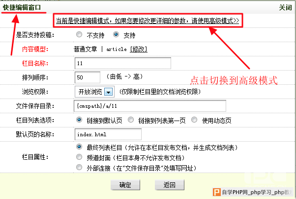 这里我们点击每个栏目后面的快捷编辑图标如何设置dedecms首页栏目排列顺序或者点击“更改”(注:这里略有不同的是点击快捷图标进入的是快捷编辑模式,而“更改”直接进入的是高级编辑模式,具体见下面两张示例图),不过我们只需要关注“内容模型”和“栏目名称”两个参数的设置就可以