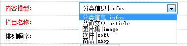 正常来说我们遵守这两点进行修改就可以了,但是在实际操作中发现“内容模型”对排序也存在影响,dedecms在增加栏目的时候需要选择栏目内内容的模型,dedecms主要提供了“分类信息”、“普通文章”、“图片集”、“软件”、“商品”这5种模型.