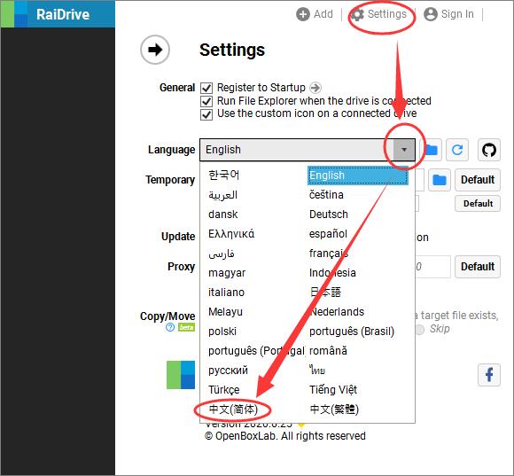 3、在Windows系统下载RaiDrive(官网下载地址:https://www.raidrive.com/download)到电脑上安装并运行。软件默认显示的是英文,为了操作方便,我们先把它改成中文:点Settings,在Language选中文简体,软件立即变成中文界面了;