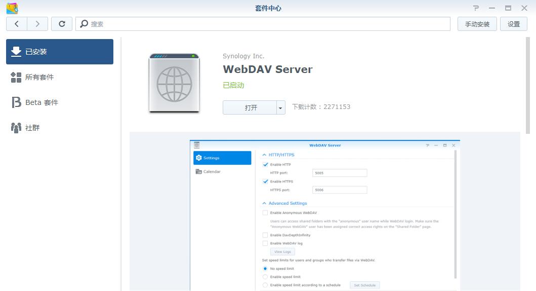 1、在群晖的套件中心安装WebDAV Server套件;